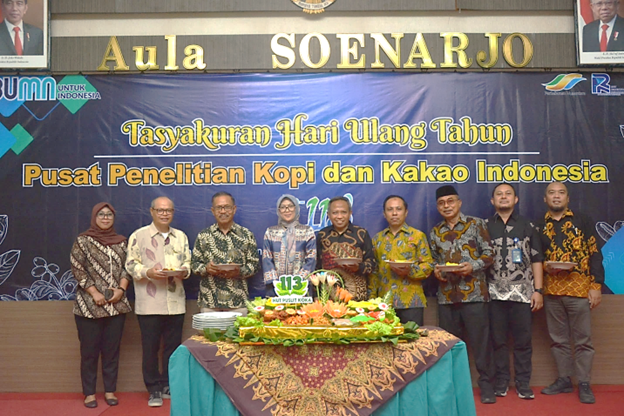 Jember : Bertepatan pada hari Jumat tanggal 16 Februari 2024, Pusat Penelitian Kopi dan Kakao Indonesia (Puslitkoka) - PT Riset Perkebunan Nusantara memperingati Hari Ulang Tahun yang ke 113 di Aula Soenarjo Kantor Puslikoka Jember. Hadir dalam perayaan HUT Puslitkoka tersebut Dr. Ir. Iman Yani Harahap selaku Direktur PT Riset Perkebunan Nusantara,  Dr. Ir. Misnawi selaku SEVP Operation II, Dini Astika Sari, M. Biotech. selaku Kepala Puslitkoka, para Direktur Puslitkoka Periode Tahun 2000-2005 Dr. Zaenuddin, 2015-2018 Dr. Misnawi, 2018-2022